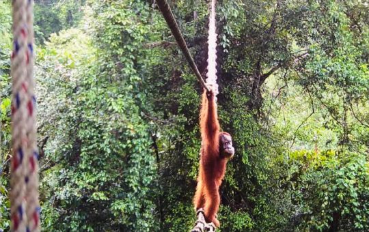 Endangered orangutan filmed using canopy bridge to cross public road in Indonesia: “A world first”